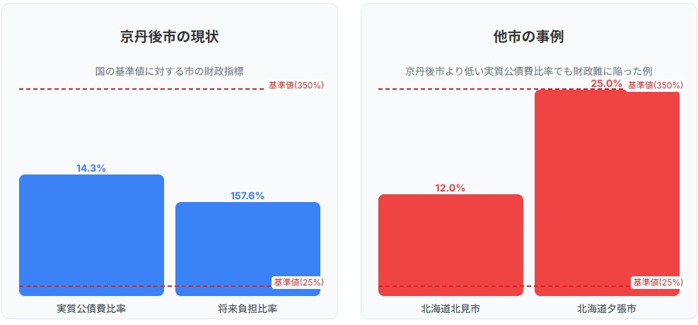 右のグラフ「将来負担比率」:棒グラフは、京丹後市の将来負担比率157.6%、北見市の将来負担153.5%が、国の基準値(将来負担比率350%)よりはるかに低い安全な範囲にあることを示します。